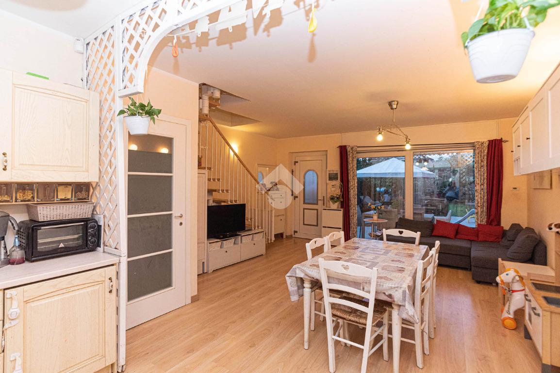 La zona giorno, attraverso l'ampia vetrata, è direttamente collegata al patio e giardino privato che misurano complessivamente circa 700 mq.